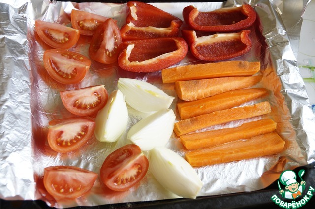 Овощи промыть, обсушить и нарезать небольшими кусочками, выложить на противень застеленный фольгой, накрыть сверху тоже фольгой и запечь в духовке при 180 гр около 15 минут, снять с верху фольгу и печь еще 15 минут.