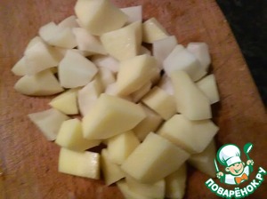 При конце варки гороха, добавляем чайную ложку соды. некоторые горошины разварятся, а некоторые останутся целыми. Когда горох готов, выливаем воду в которой он варился и добавляем кипяток, картофель, грибы, лук с морковью и перцем, лавровый лист и черный перец