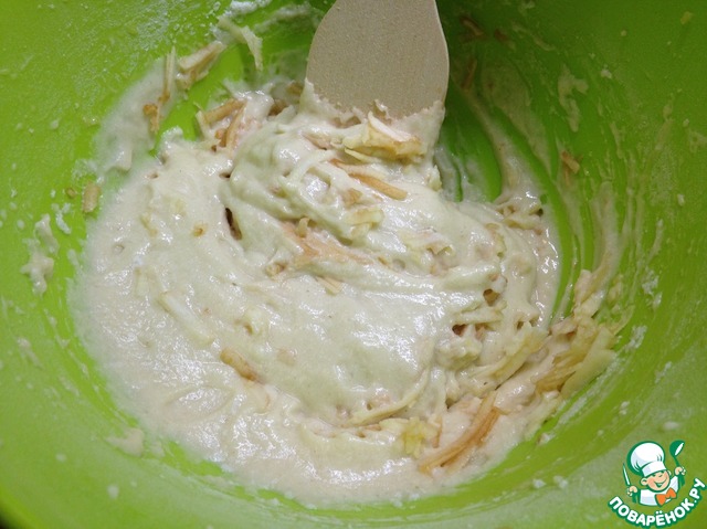 Большое яблоко, натераем на крупной терке и соединяем с тестом. Опять хорошо и осторожно перемешиваем.