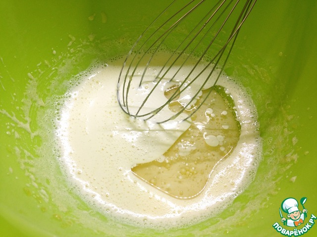 Добавляем к взбитым желткам воду, оливковое масло и взбиваем до однородности.