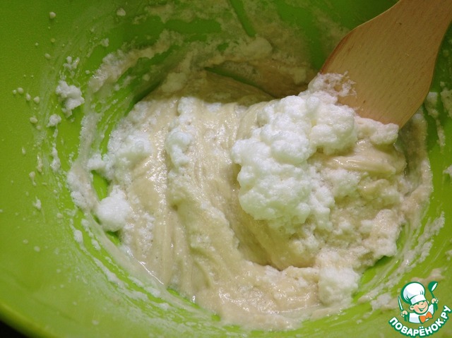 Взбитые белки вводим в тесто. Лопаткой хорошо всё перемешиваем осторожными движениями снизу вверх, зачерпывая тесто со дна миски.