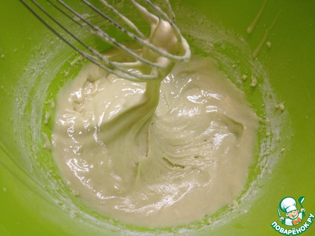 К взбитой массе высыпаем муку, разрыхлитель и хорошо вымешиваем. Тесто получается густое. На фотографии видна его консистенция.