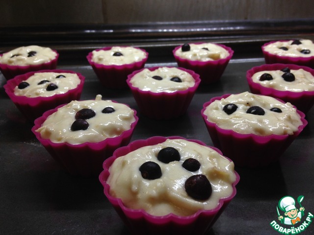 Тесто выкладываем в силиконовые формочки до половины. В каждую формочку помещаем 4-5 любых ягод. У меня замороженная смородина.