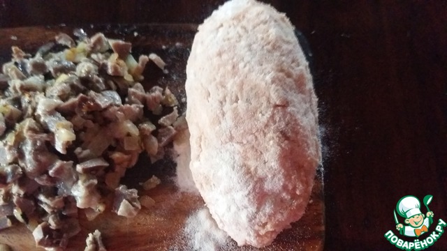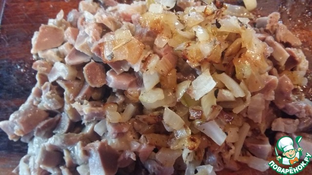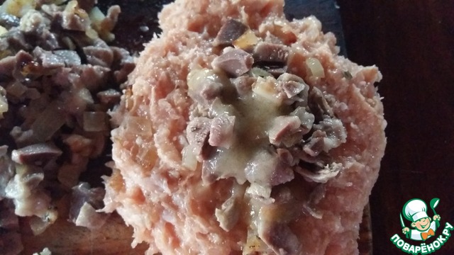 В 1 ч. л. сливочного масла слегка обжарить 1 ч. л. муки, постоянно помешивая постепенно влить 10% сливки, посолить, поперчить, добавить щепотку мускатного ореха. Готовить до состояния густой сметаны. Добавить в соус куриные желудочки и перемешать. Из куриного фарша на ладони сделать лепешку, в центр выложить начинку и сформировать цеппелин.