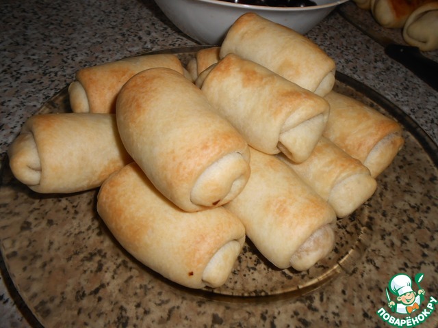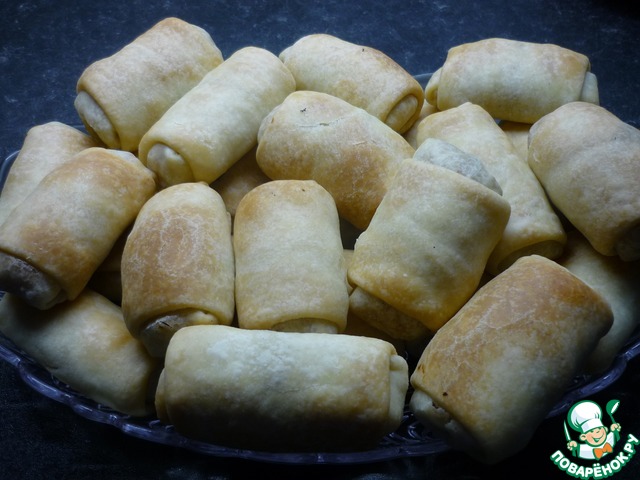 Тесто разделить на 16 частей. каждый кусочек тонко раскатать, положить начинку и завернуть, как на видео. С последнего кусочка, при помощи плунжера делаем фигурки и цепляем их на пирожки.