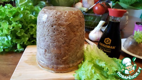 Так выкладываем до верха формочки/ёмкости. Я прижимаю сверху мясо деревянной крышечкой, но это не обязательно.