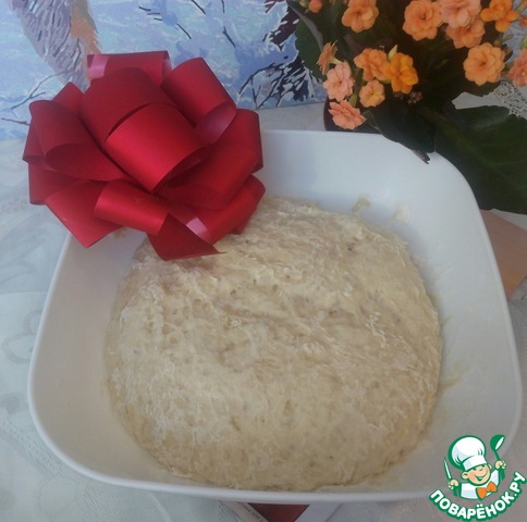 50гр. муки смешать с дрожжами, влить воду (может уйти больше, чем в рецепте). Поставить опару в тёплое место на 15 минут.