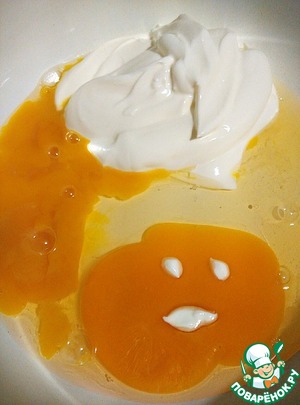 Яйца разбить в миску, посолить, добавить сметану. Перемешать.