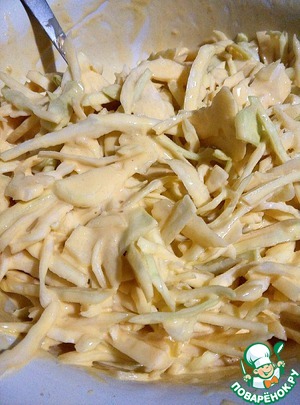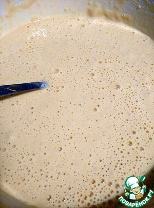 Соединить муку с жидкой массой. Перемешать до однородности.