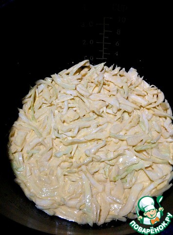 Чашу МВ смазать маслом и выложить наш будущий пирог. Аккуратно разровнять поверхность.