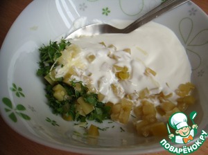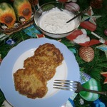 И хоть традиционно боксти подаются без какого-либо соуса, я решила отступить от традиций и ни капли не пожалела. Пока жарились оладьи я приготовила к ним соус: смешать сметану, рубленую зелень, мелко нарезанный маринованный огурчик и зубчик чеснока.