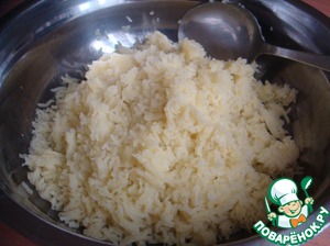 Половину картофеля отварить. Отварной картофель помять картофелемялкой или пропустить через пресс. Я перетерла через мелкое сито.