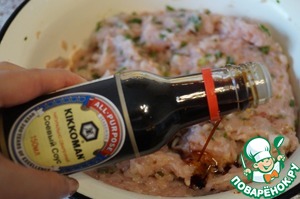 Куриное филе пропустить через мясорубку (или взять готовый фарш), добавить специи, зеленый и репчатый лук и заправить соевым соусом ТМ Киккоман.