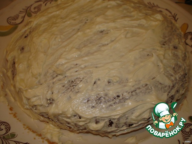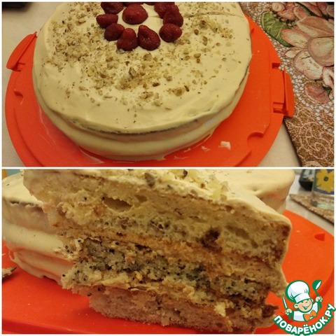Готовые коржи уложить друг на друга, смазывая кремом, в следующем порядке: корж с орехами, корж с маком, корж с изюмом.