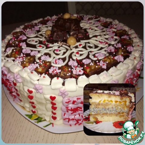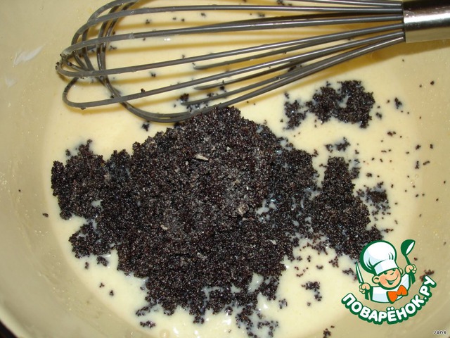Сделать 2 корж: 1 яйцо, 0,5 стак. сахара, 0,5 стак. сметаны, 0,5 стак. муки, немножко соды, подготовленный мак.