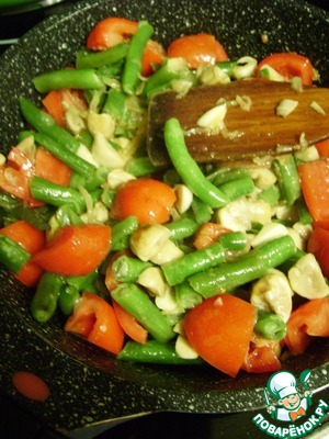 Добавить фасоль, так же не размораживая. Жарить до размораживания и легкого румянца.
