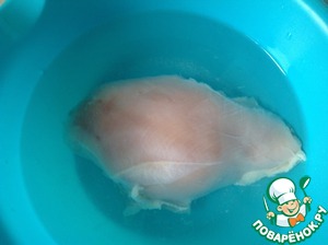 В посуду для маринования налить холодную воду и всыпать соль, перемешать. Выложить в соленую воду грудку на 2 часа.