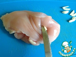 Чеснок очистить и нарезать на полосочки. Грудку достать из воды, обтереть бумажными салфетками. Сделать по всей грудке надрезы и нашпиговать чесноком.