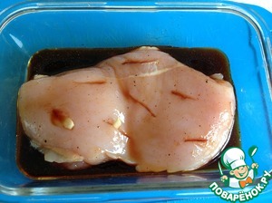 Нашпигованную грудку тщательно обмазать соевой заливкой. В форму для запекания выложить грудку вместе с заливкой. ВАЖНО!!! Духовку нагреть до 250 гр, и на 10 минут отправить грудку в духовку. Ровно через 10 минут духовку выключить, не открывать. Оставить грудку в духовке до полного остывания, не менее чем на 2 часа. Остывшую грудку нарезать порционно. Церный цвет-это не горелая грудка, а соевый соус с медом при запекании обволакивают грудку, и внутри она получается нежной и сочной.