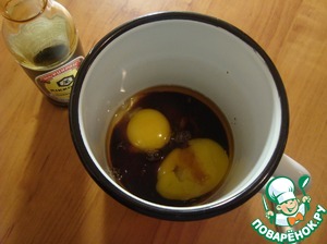 Делать начинаем блинчики, пока делается начинка. В посуду разбиваем яйца, кладём сахар, соевый соус и воду. Вилкой всё соединяем.