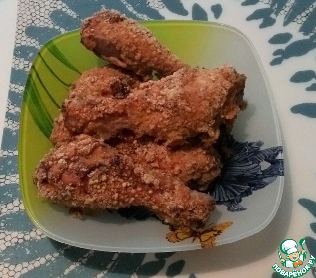 Куриные ножки сначала тщательно обмакнуть в яйца, а потом обвалять в смеси из сыра, муки и сухарей. Выложить на противень.