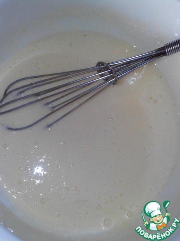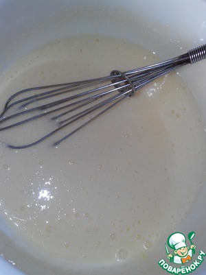 Печем коржи. 1 яйцо взбиваем с полстаканом сахара, добавляем полстакана муки, полстакана сметаны и половину ч. л. разрыхлителя. Взбиваем.