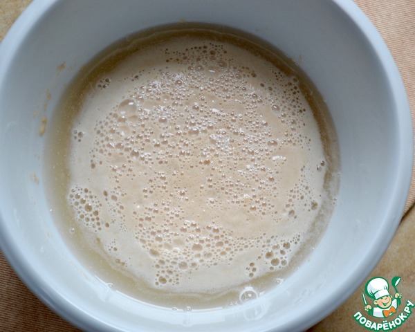 В теплой (37-38ºC) воде развести сахар и дрожжи. Слегка размешать и дать дрожжам активизироваться (10-15 минут).