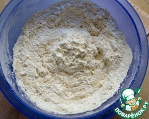 Перелить дрожжевую смесь в большую миску и добавить просеянную муку и соль. Муку всыпайте частями, т. к. в зависимости от ее качества, муки может потребоваться чуть меньше.