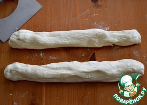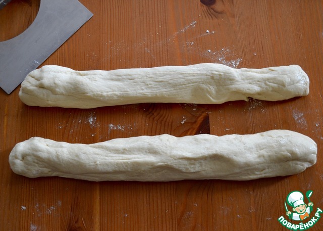 Выложить воздушное и очень податливое тесто на рабочую поверхность, слегка присыпанную мукой и разделить на две части, смазав руки оставшимся маслом. И опять облагчаем себе процесс приготовления багетов, т. к. не будем раскатывать и сручивать багеты, а просто растянем каждый кусочек теста в длину - быстро и просто. Выложить багеты на противень, застеленный пекарской бумагой и присыпать слегка мукой. Накрыть полотенцем и дать отдохнуть еще буквально 15 минут.