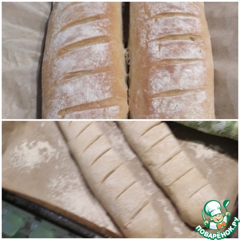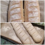 За это время включаем разогреваться духовку на 195ºC. Тем временем, багеты заметно увеличились... Сделать на поверхности поперечные косые надрезы острым лезвием и поставить выпекаться в горячую духовку ровно на 15 минут. Важно - под противень предварительно поставить форму с кипятком и стенки духовки сбрызнуть водой, прежде чем поставить багеты на выпечку.
