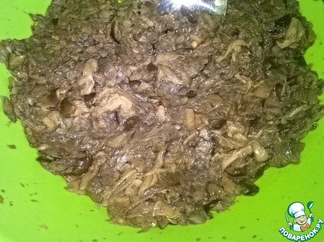 Грибы (у меня подберезовики) растолочь. Грибы должны разделиться на мягкие волокна и дать сок (чуть-чуть)