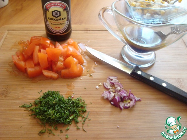Помидор режем мелким кубиком, лук режем очень мелко и совсем немного, рубим укроп. Делаем заправку. В масло оливковое наливаем соевый соус, добавляем лимонный сок по вкусу и по желанию и вкусу досаливаем. Всё хорошо соединяем.