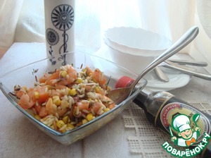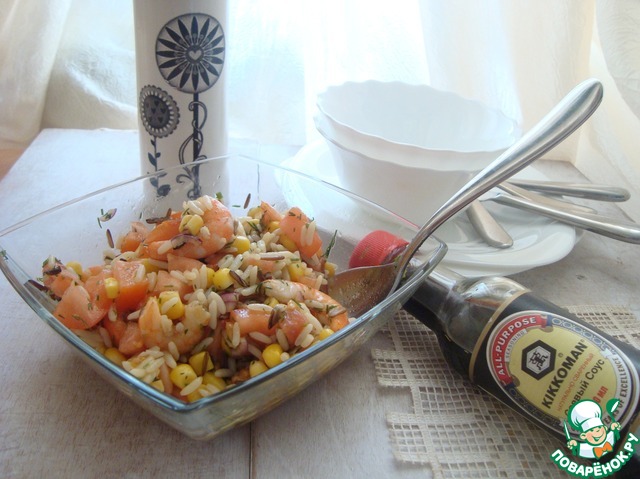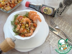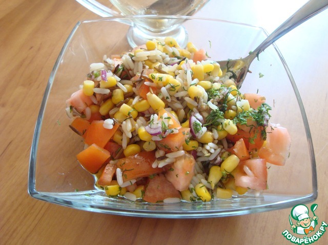Креветки отварила в пароварке в СВЧ за 3 минуты при мощности 800. Рис был сварен заранее. Выкладываем его в салатник, добавляем кукурузу, лук, укроп и помидор. Креветки чистим и тоже отправляем с салатник. Всё перемешиваем. Заправляем заправкой.