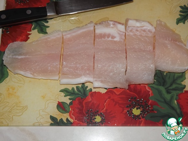 Режем рыбу на равные части, примерно 3-4 см, не тоньше, иначе при переворачивании они у вас разломаются