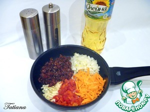 • Морковь, лук и чеснок мелко нарежьте, потушите в небольшом количестве подсолнечного масла, посолите, поперчите. Добавьте мелко резанные вяленые томаты.