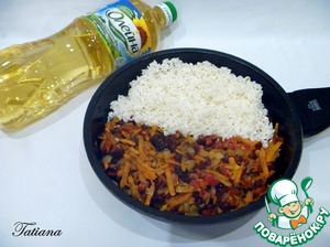 • Рис хорошо промойте, слейте воду через сито, добавьте влажный рис к тушеным овощам, перемешайте.