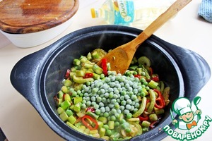 Добавить зеленый замороженный горошек, соевый соус, соль по вкусу, сахар, паприку молотую и готовить 3-4 мин.