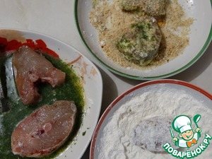 Достаем рыбу из холодильника и приступаем к жарке, предварительно панируем ее следующим образом. В яйцах - муке - яйцах - сухарях, плотно обжимая панировку.