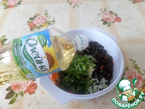 Нарезанные овощи, морскую капусту и зелень выкладываем в чашку. Добавляем наршараб и растительное масло "Олейна". Перемешиваем.