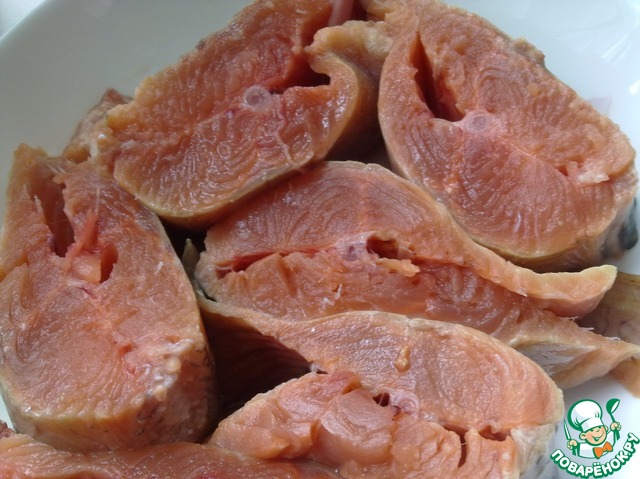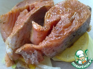 Горбушу разрезать на стейки. Посыпать смесью перцев, посолить и оставить при комнатной температуре на 10 минут.