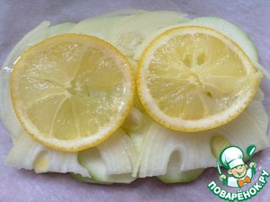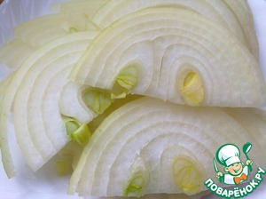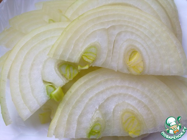 Пока рыба маринуется, подготовить овощи. Лук необходимо нарезать тонкими полукольцами.