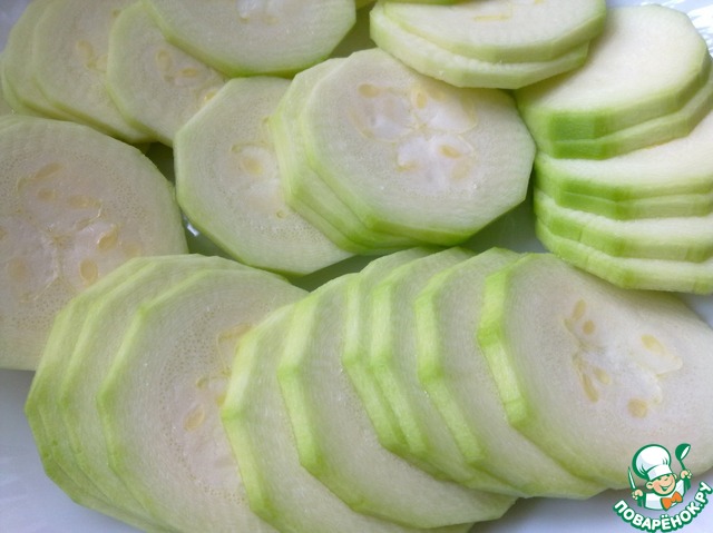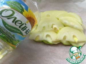 Запекать рыбу я предлагаю в пергаменте. Это и очень практично, и результат приготовления всегда радует. Для каждой порции приготовим бумагу для запекания (необходимо заготовить листы пергамента приблизительно 30x30 см.) На середину выкладываем нарезанный кабачок.