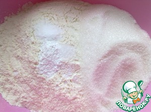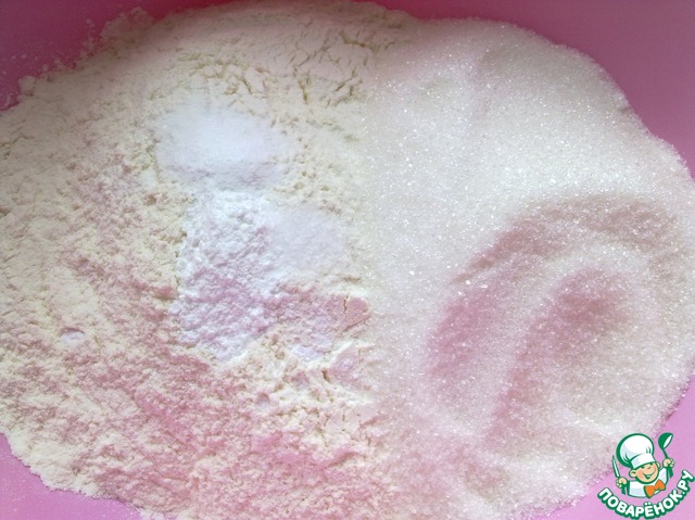 Соединить сухие ингредиенты: просеянную муку с разрыхлителем, сахар, ванилин и хорошо перемешать.