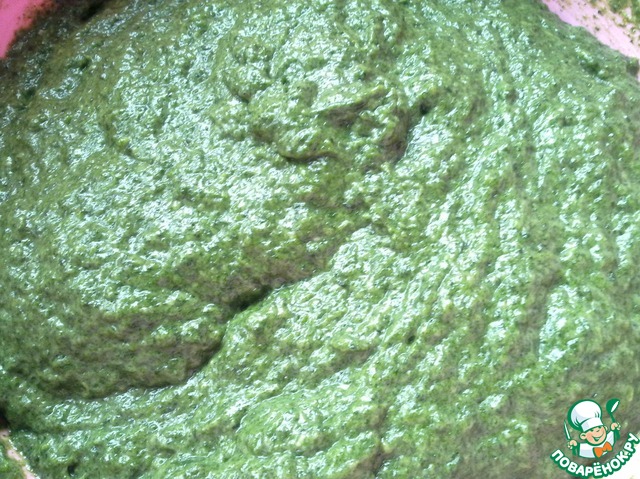 Теперь добавить – измельченный шпинат и воду (100 мл) все хорошо перемешать. Тесто получается красивого изумрудного цвета.