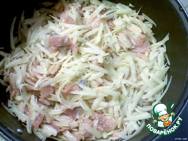Нарезать сёмгу небольшими кусочками, выложить в миску к картофелю, добавить крахмал, соль и перец.