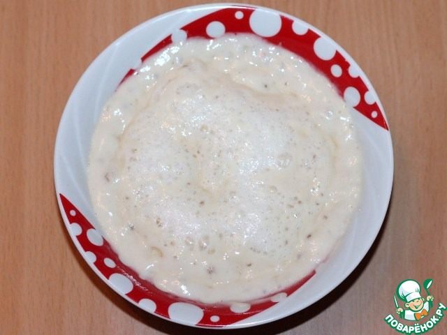 1. Приготовим опару. Дрожжи развести в теплой воде, добавить 1 ст. л. сахара и 2 ст. л. пшеничной муки. Накрыть опару салфеткой и убрать в теплое место.
