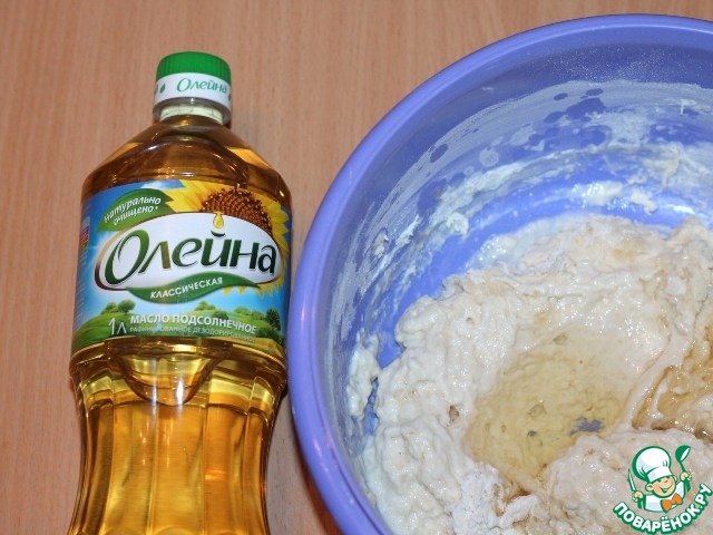 2. Приготовим тесто. В готовую опару добавить масло, сахар, соль и просеянную муку.