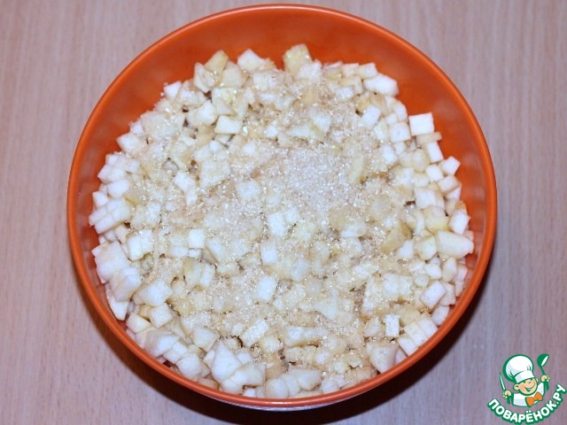 4. Приготовим начинку. Моем и очищаем от шкурки и семечек яблоки. Мелко нарезаем кубиками, смешиваем с 1 ст. л. крахмала и 1-2 ст. л. сахара.