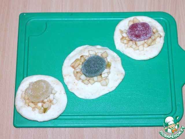 5. Подошедшее тесто обмять. Разделить на 16 частей. Каждую часть теста раскатать в круг, положить начинку из яблок и 1 мармеладку.