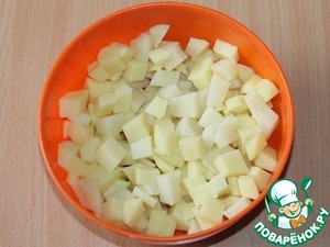 2. добавить очищенный от шкурки и нарезанный кубиками картофель.